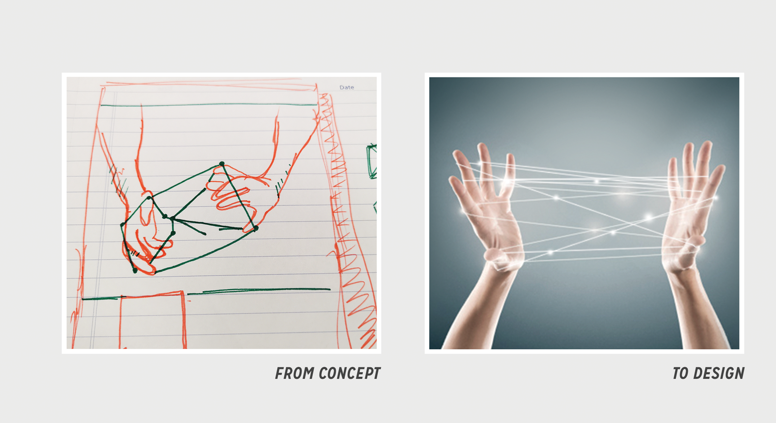 The solution decided upon was the cat's cradle. An image of a pair of hands being connected by energy laced threads. It added the needed human element to the complex idea of exchange between two points, the strings looked and could be seen as the power lines transfering energy and it allowed the end user to be both the designer and engineer of thier experience.
